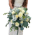 Un hermoso ramo de novia en tonos blancos y verdes, diseñado para complementar el look nupcial con un toque romántico y sofisticado.